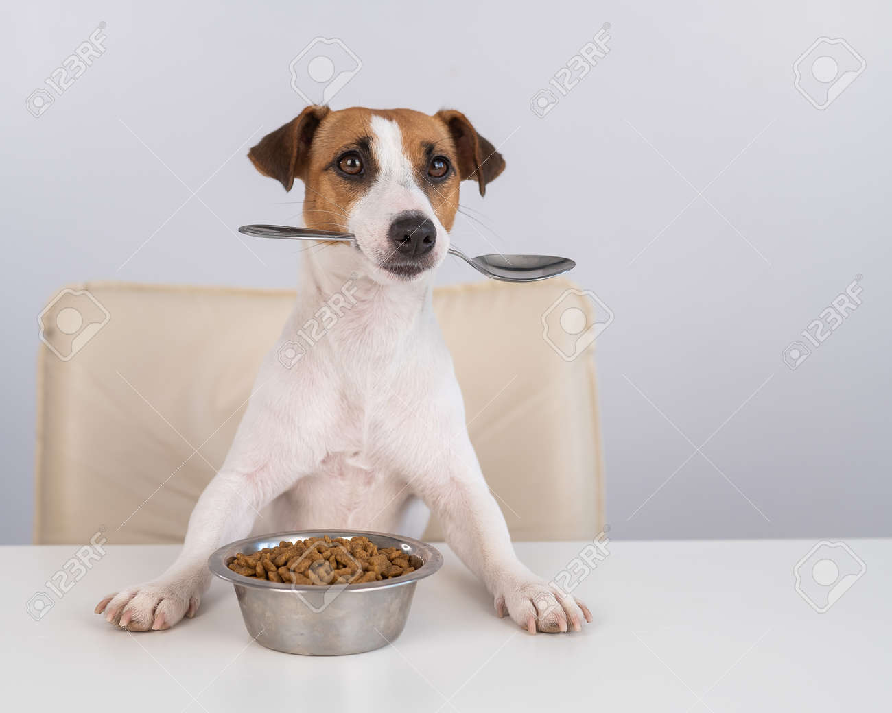 El Perro Jack Russell Terrier Se Sienta En Una Mesa Con Un Plato De Comida Seca Y Sostiene Una Cuchara En La Boca. Fotos, retratos, imágenes y fotografía de archivo libres de