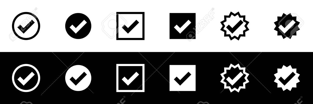 Conjunto De Iconos Verificado. Colección De Iconos De Diseño Plano Aislado Sobre Fondo Blanco Y Negro. Confirmar, Verdadero, Verificar, Garantizar, Acertar, Corregir, Aprobar Y Validar. Ilustraciones svg, vectoriales, clip art vectorizado libre