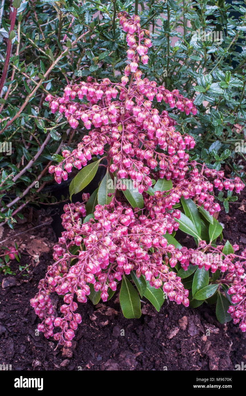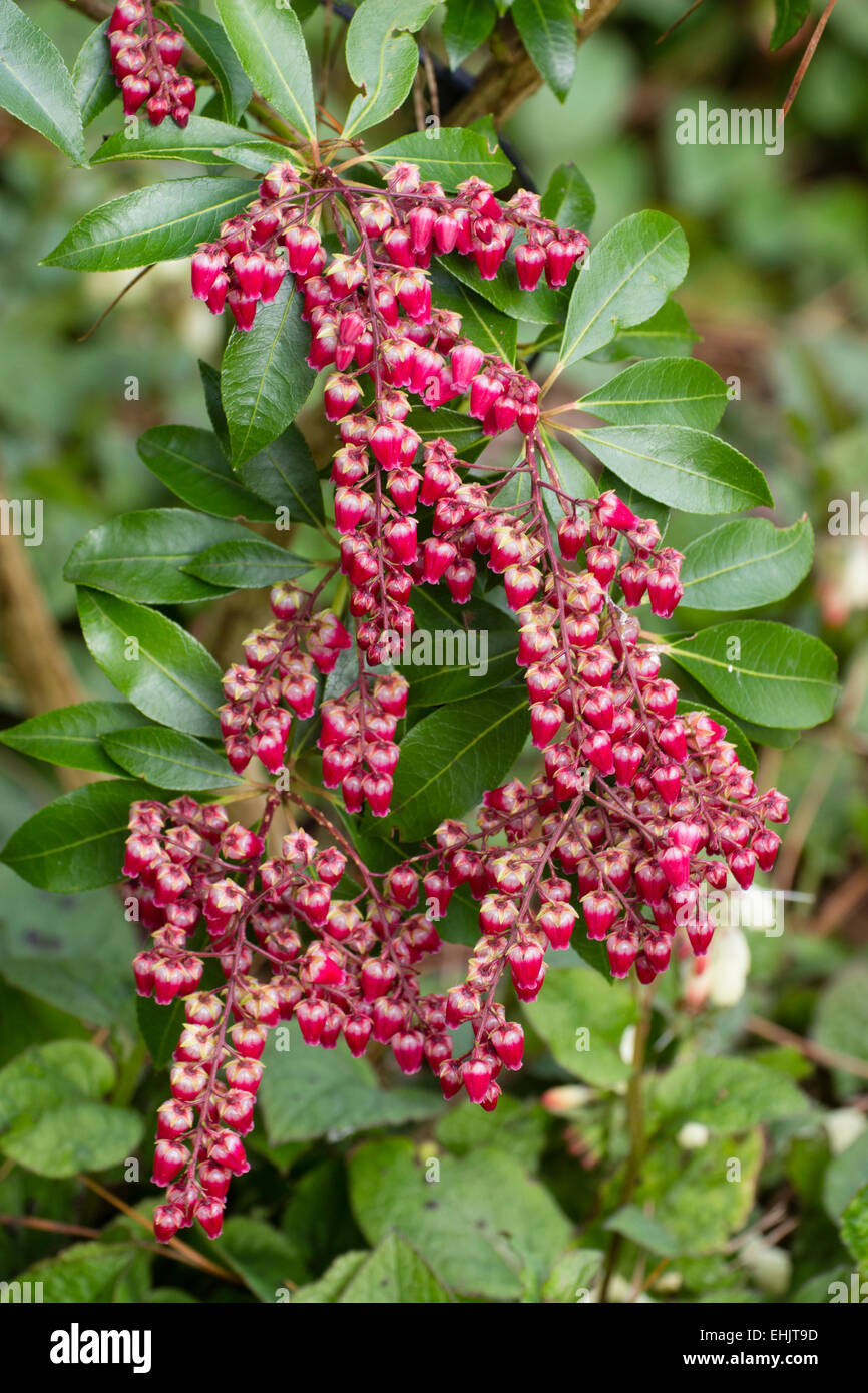 Pieris japonica 'Valle de San Valentín' en flor en el jardín de primavera a finales de invierno campana flores Fotografía de stock - Alamy