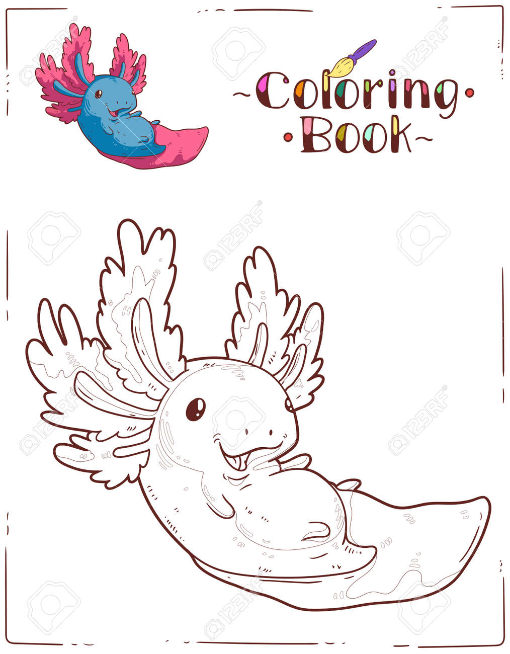Ajolote, Una Hoja Para Colorear. Imagen De Contorno De Dibujos Animados De Juguetón Bebé Axolotl Con Ejemplo De Color. Una Página De Libro Para Colorear. Ilustración De Contorno Para La Educación Preescolar