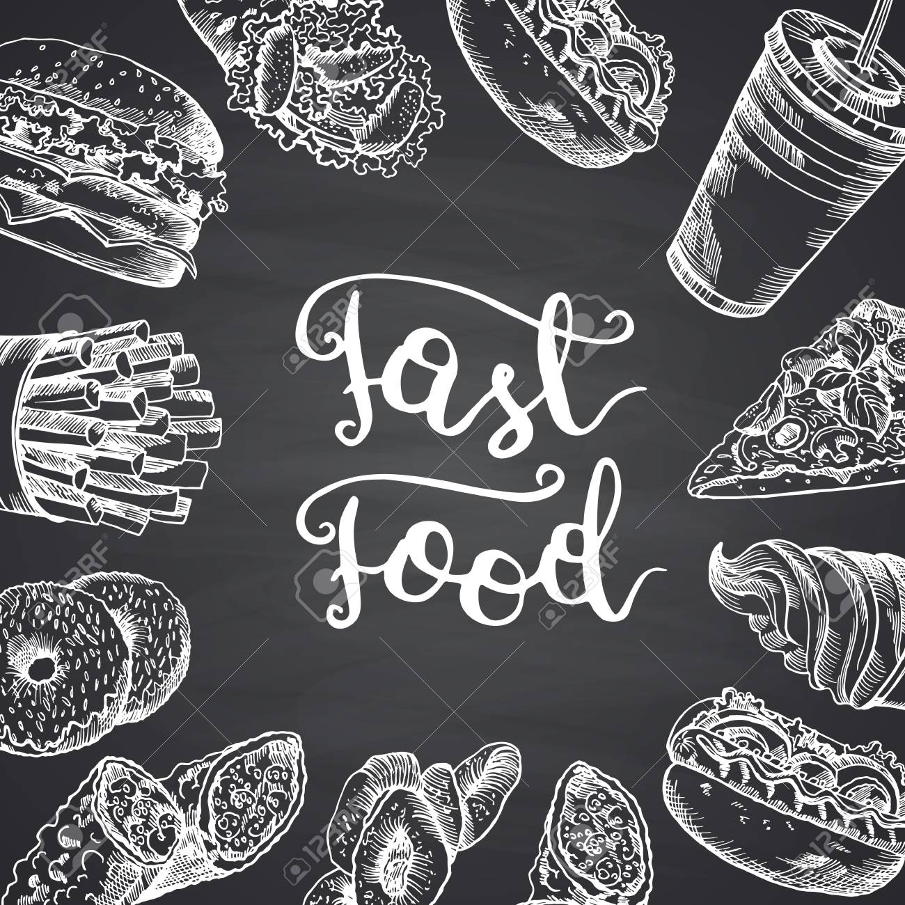 Ilustración De Vector Con Elementos Blancos De Contorno De Comida Rápida Que Rodean Letras Sobre Fondo De Pizarra Negra Ilustraciones svg, vectoriales, clip art vectorizado libre de derechos. Image 93209632