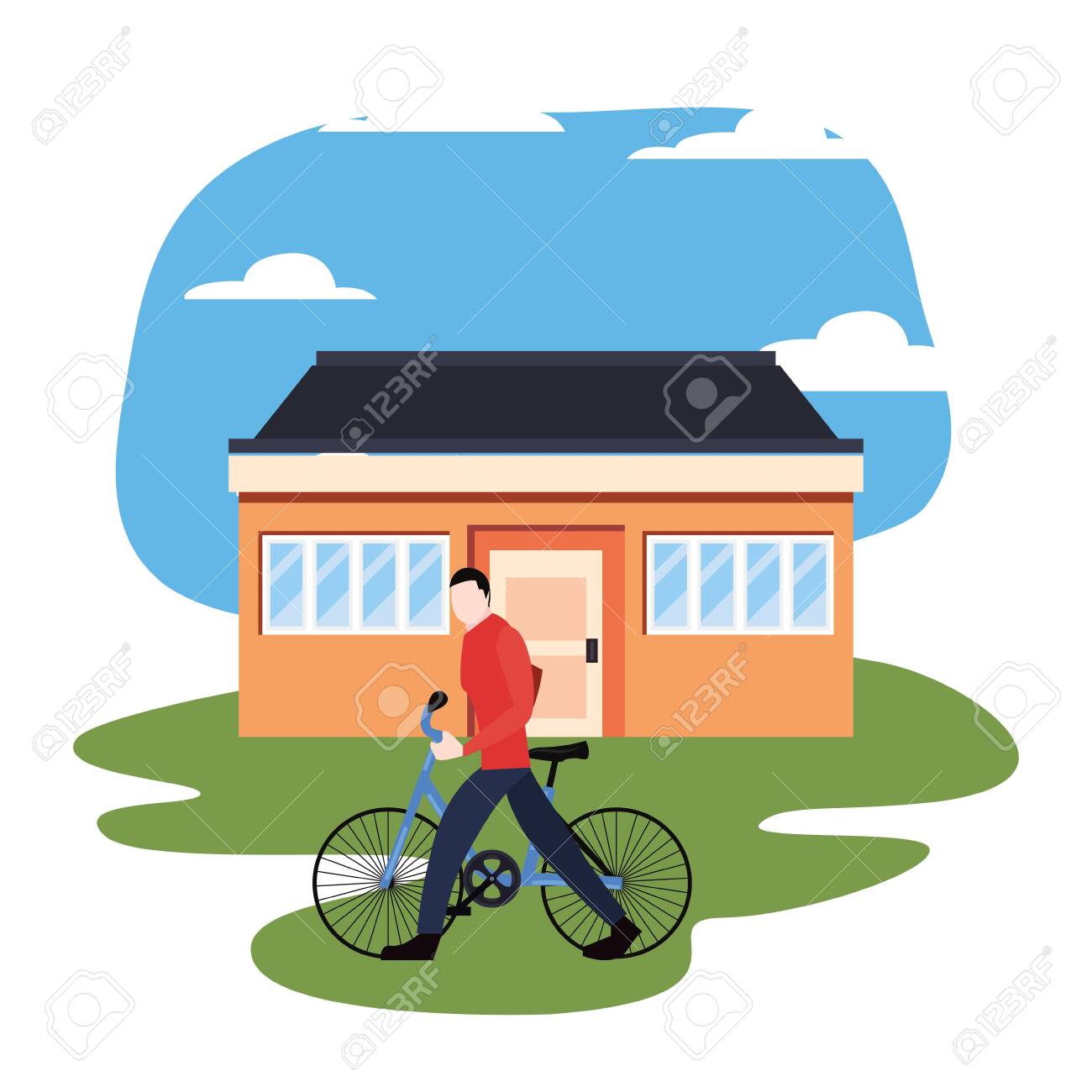 Hombre Con Bicicleta Frente A La Ilustración De Vector De Casa Ilustraciones svg, vectoriales, clip art vectorizado libre de derechos. Image 129473706