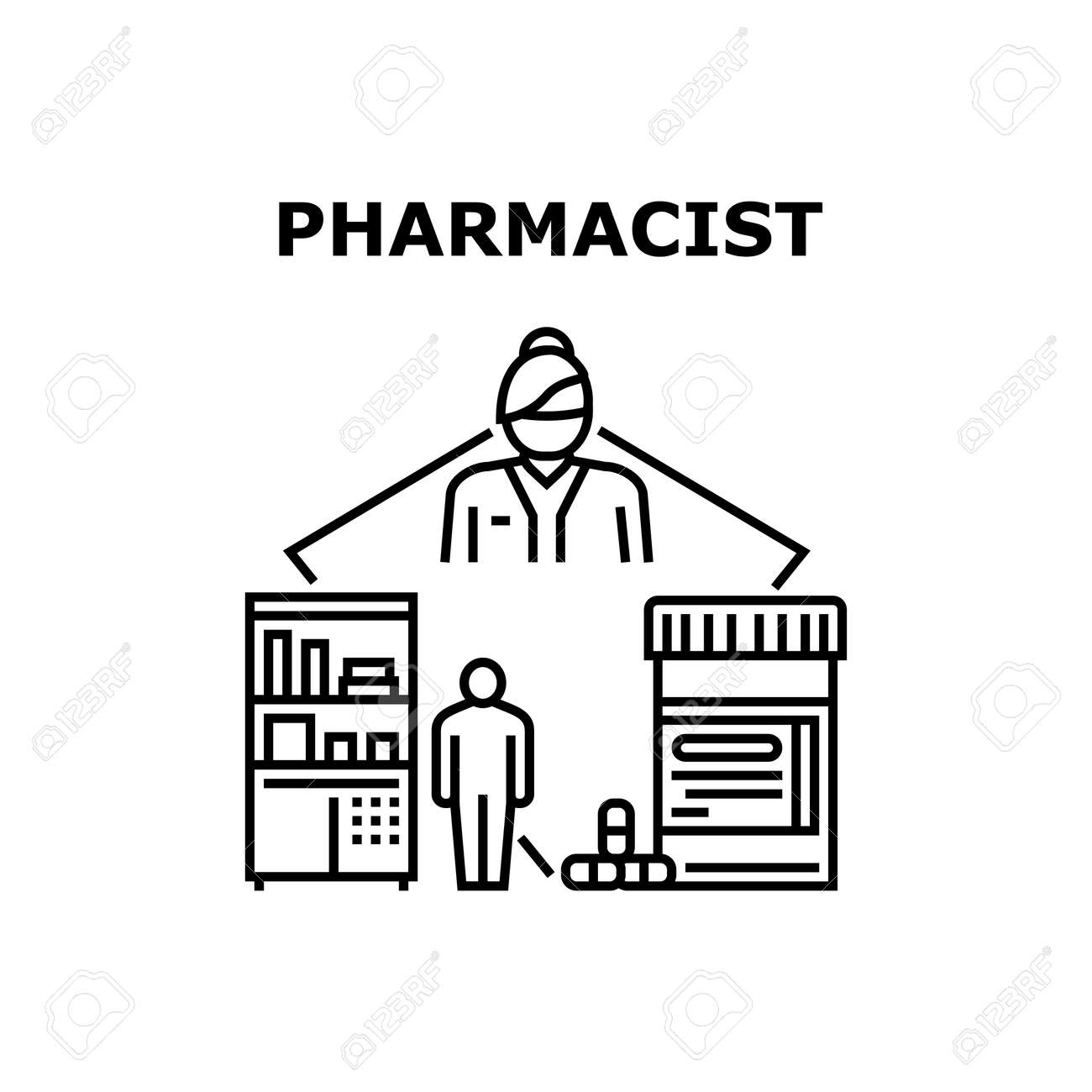 Concepto De Icono De Vector De Trabajo Farmacéutico. El Trabajador Farmacéutico Ayuda Al Cliente A Buscar Medicamentos En La Tienda De Farmacia. Experto En Farmacia Que Vende Jarabe De Medicamentos Y Atención