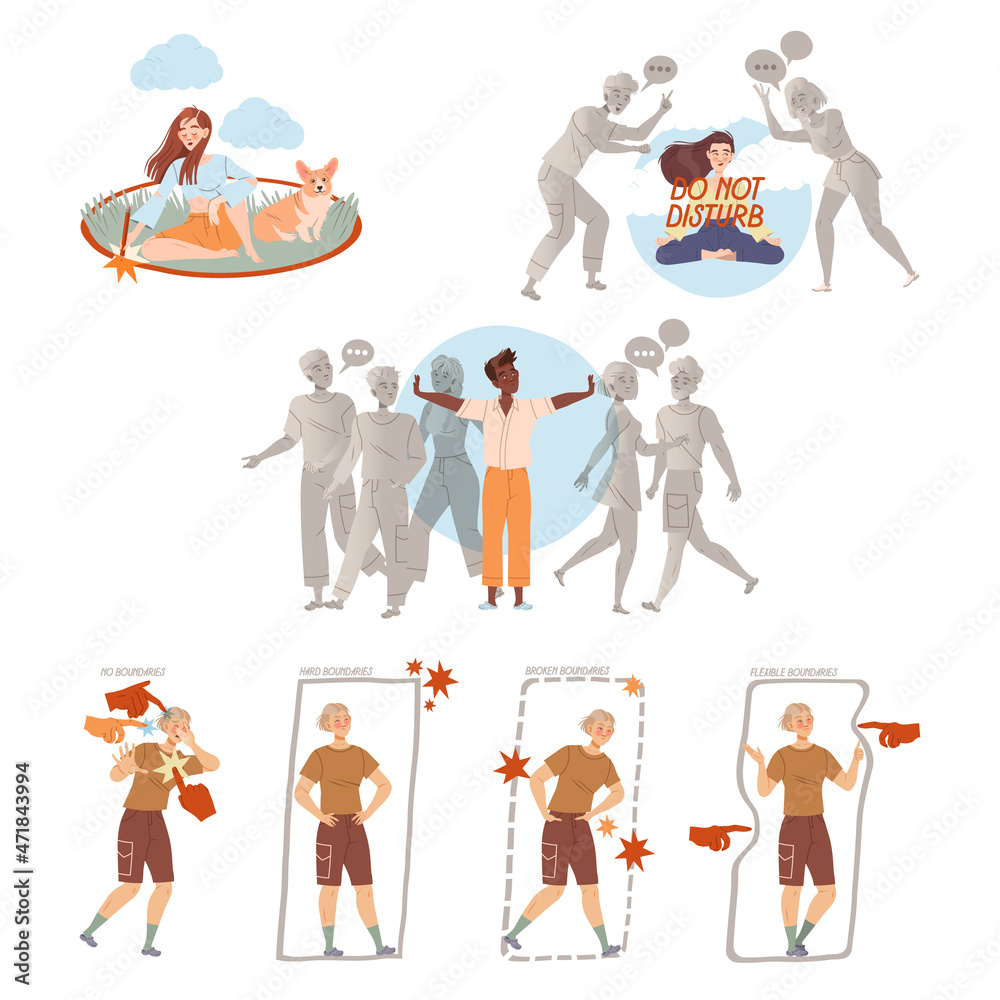 Personal boundaries set, People standing inside drawn lines. Self isolation, unsocial lonely person, personal space vector illustration Stock Vector | Adobe Stock