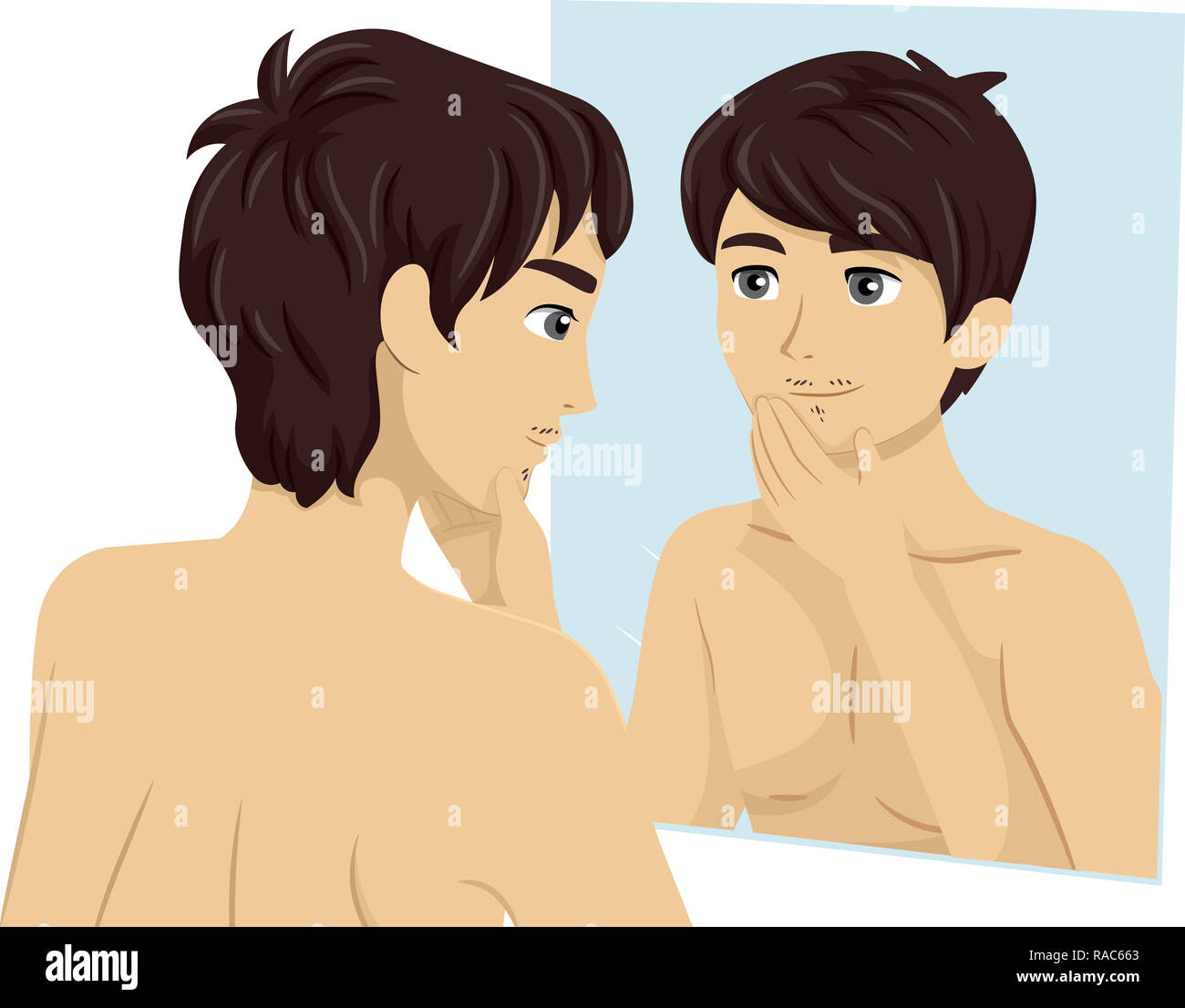 Ilustración de un chico adolescente busca un crecimiento de vello facial en el espejo durante su pubertad Fotografía de stock - Alamy