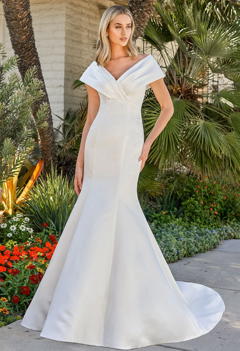 Vestidos de novia sencillos de playa, sirena/trompeta, hombros descubiertos, manga casquillo, tren de corte, vestidos de novia de satén con fruncido 2024 2024 -… | Casual beach wedding dress, Satin bridal gowns,