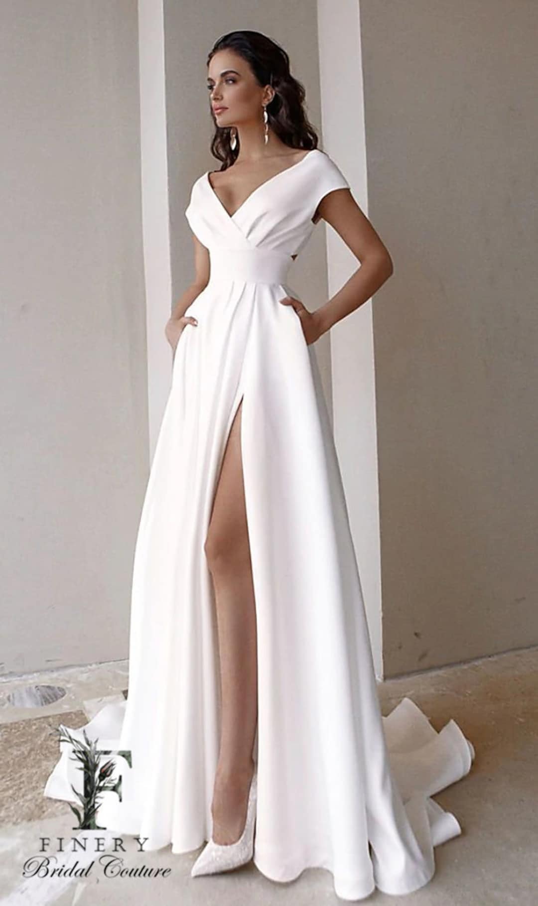 Vestido de novia de manga casquillo mate, vestido de novia con bolsillos, vestido de novia minimalista simple, vestido de novia de división alta, arquitectónico - Etsy México