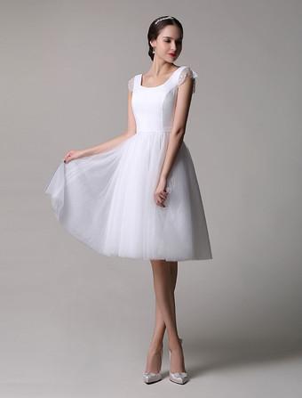 Vestidos De Novia Sencillos Tul Cuello Redondo Longitud De La Rodilla Vestido Corto De Novia Con Manga Del Casquillo De Encaje - Milanoo.com