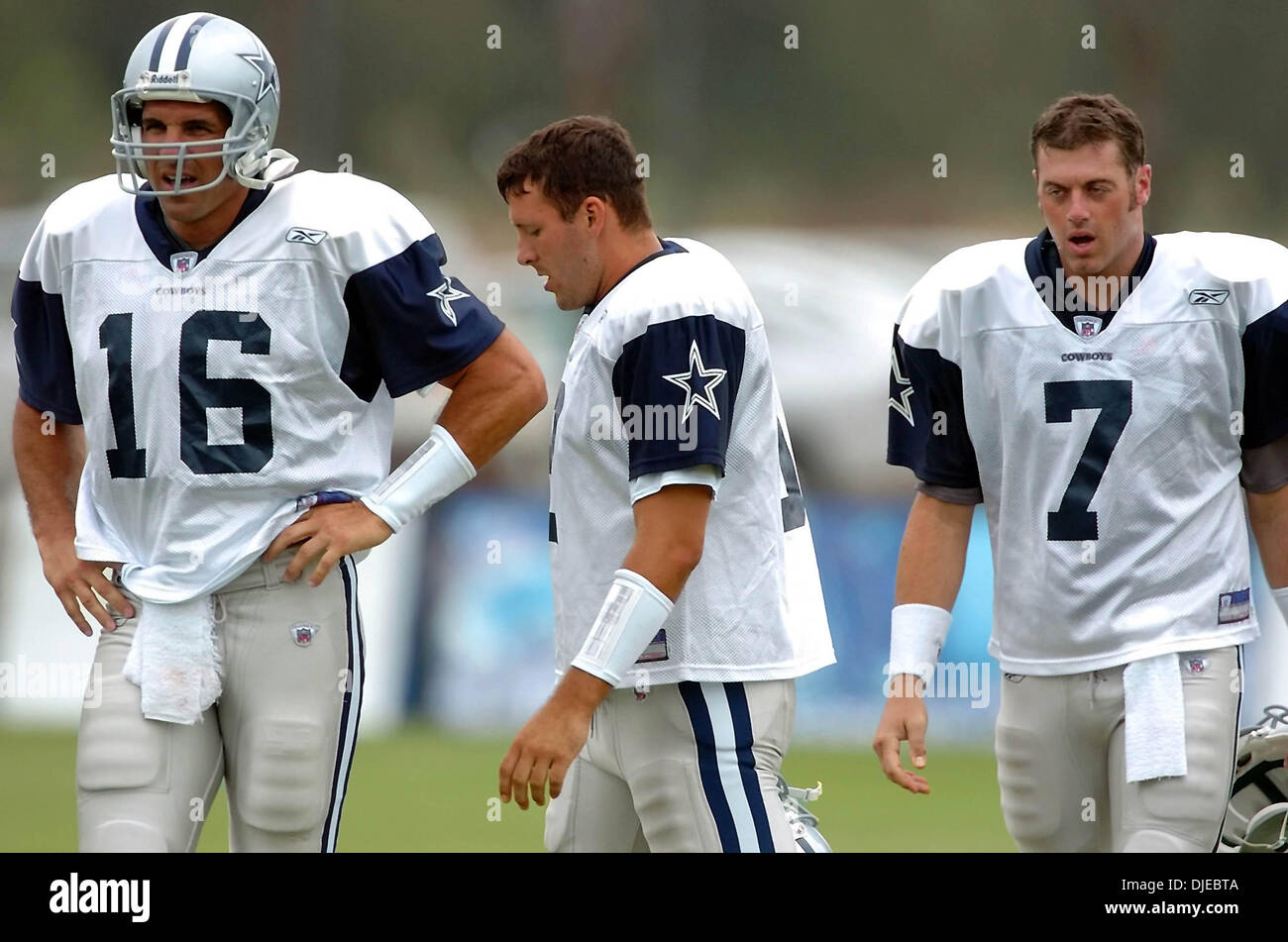 Aug 04, 2004; Oxnard, CA, USA; The Cowboys three remaining quarteracks, VINNY TESTAVERDE (16), TONY ROMO (9) and DREW HENSON (7) leave the field after morning practice Wednesday, August 4, 2004 in