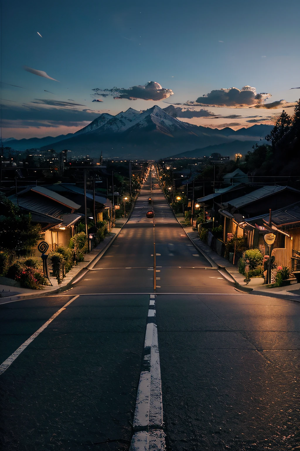 Una vista de una calle con una montaña en la distancia - SeaArt AI