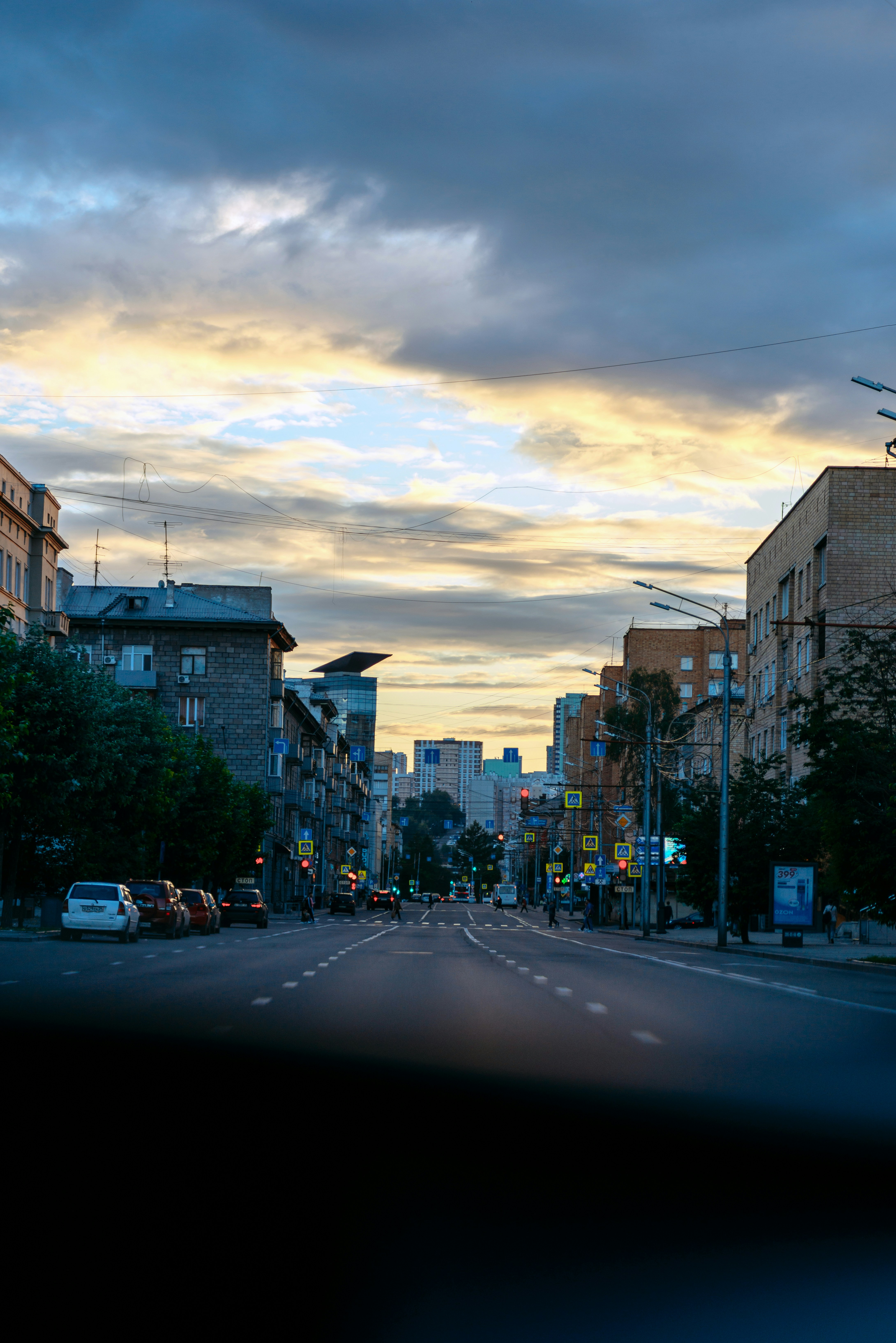 Una vista de una calle de la ciudad al atardecer foto – Imagen de ...
