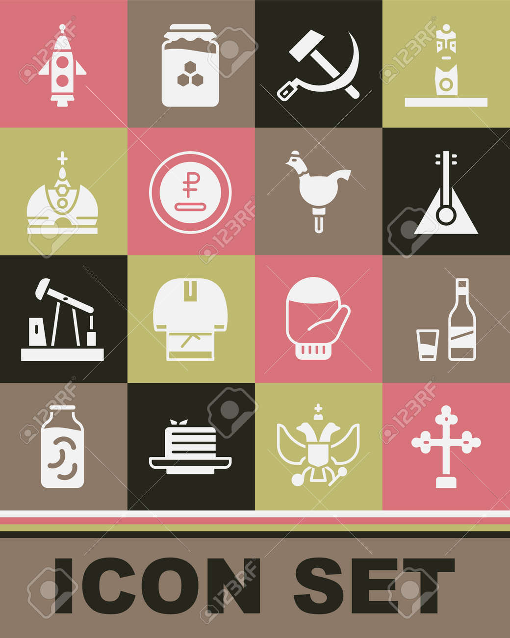 Coloque La Cruz Cristiana, La Botella De Vodka Con Vidrio, Balalaika, La URSS De Martillo Y Hoz, El Rublo, La Moneda Del Rublo, La Corona Del Rey, El Barco Rocket Y El