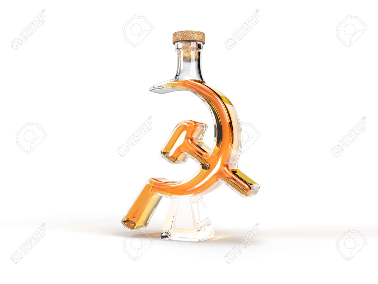 Botella Con Forma De Hoz Y Martillo Con Whisky En Su Interior. Ilustración 3d, Adecuada Para Temas De Fuentes, Alcohol Y Bebidas. Fotos, retratos, imágenes y fotografía de archivo libres de derecho.