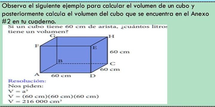 SOLVED: alguien me ayuda??? Rápido porfavor Observa el siguiente ejemplo para calcular el volumen de un cubo Y posteriormente calcula el volumen del cubo que se encuentra en el Anexo #2 en